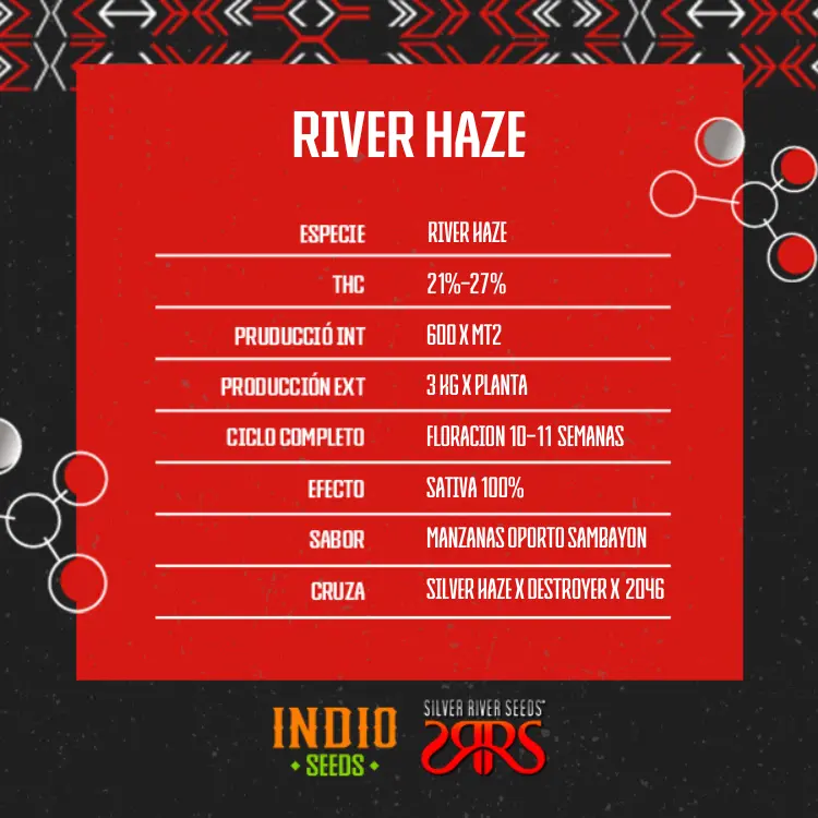 Manzanas al oporto y sambayón con tintes cítricos. Fumar sativas es lo más rico y placentero que existe. Tienen un humo especial, no cansan a la hora de repetirlas, son sabores de la revolución hippie, hierbas finas y especiadas con suaves cítricos y delicados sabores frutales o florales. River Haze hace honor a Neville, Simon y a Kiki juntos. Nada se ha perdido del Haze Original, ni de la Kali Mist, ni de la gran Destroyer (Mexican x Colombian)x Thai). El sabor es un mix de hierbas mentoladas con un horneado de peras y limones, se siente la presencia de algo de alcohol parecido a licor de caña. Los fenos más Haze salen especiados y alcanforados, las plantas con dominancia Destro en cambio tienen un plus de corcho de sidra y salame de Milán muy atenuado.